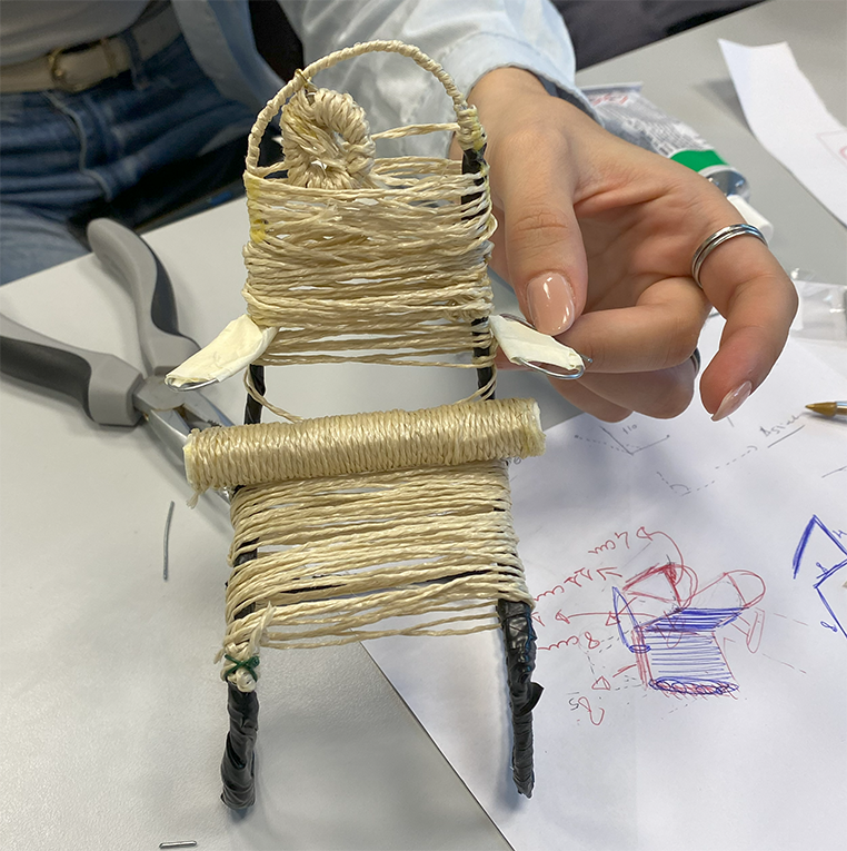 2時間で、このような椅子のモデルをグループで製作。私の講義で紹介した骨盤を立てるロールを早速用いてくれた