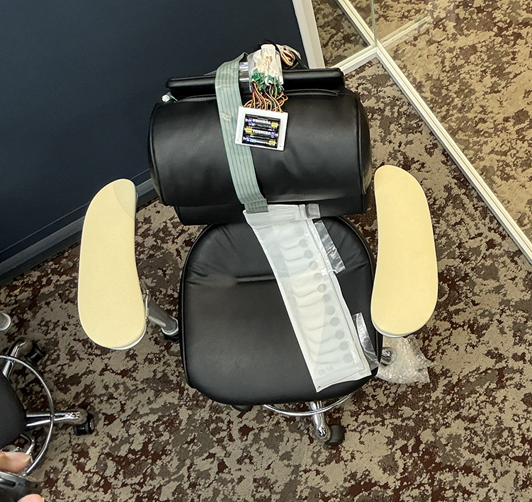 通常の体圧分布装置では、大きな測定シートで測定部分が覆い隠されてしまいます。この装置では、椅子の外観と合わせて測定ができます。