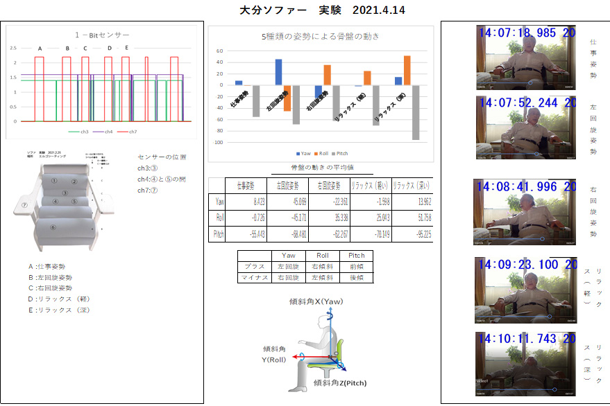 真ん中に、骨盤の動き、左が1Bit センサー とソファ上の配置。右が、要所の動画のキャプチャーです。