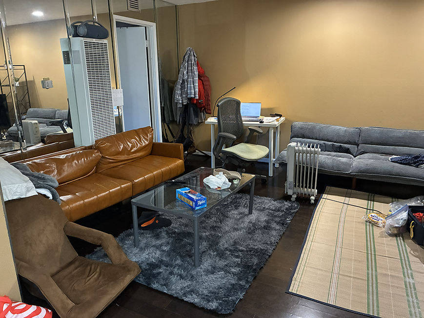 まずは、私のLAでの作業スペースをご紹介します。この左にベッドルームがあり、手前にはキッチンがあります。トイレは、シャワー付きでした。